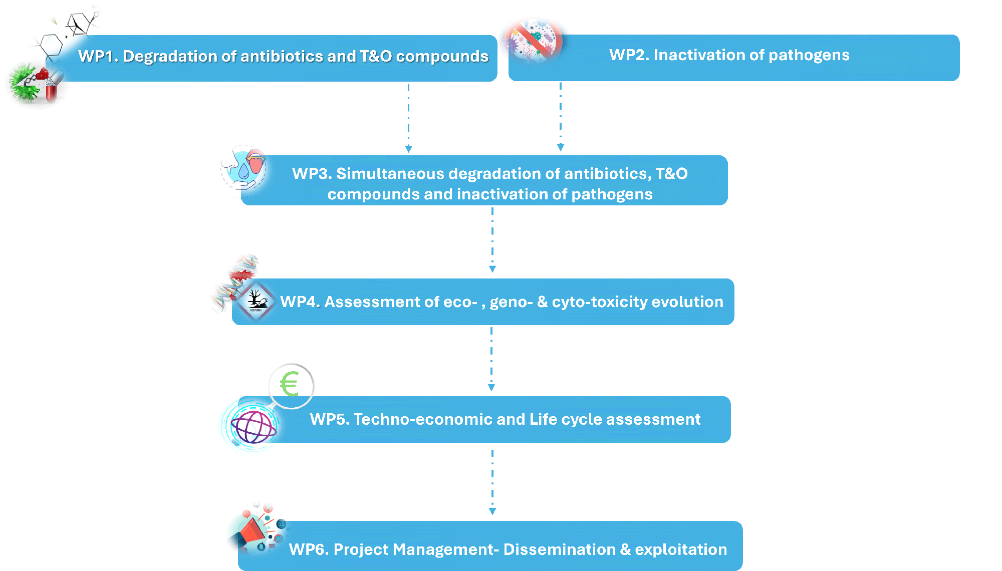 • Evaluation of the efficiency of AOPs for the simultaneous degradation of antibiotics, T&O compounds, and pathogens inactivation in different aqueous matrices (e.g. sea/fresh-water, real wastewater)